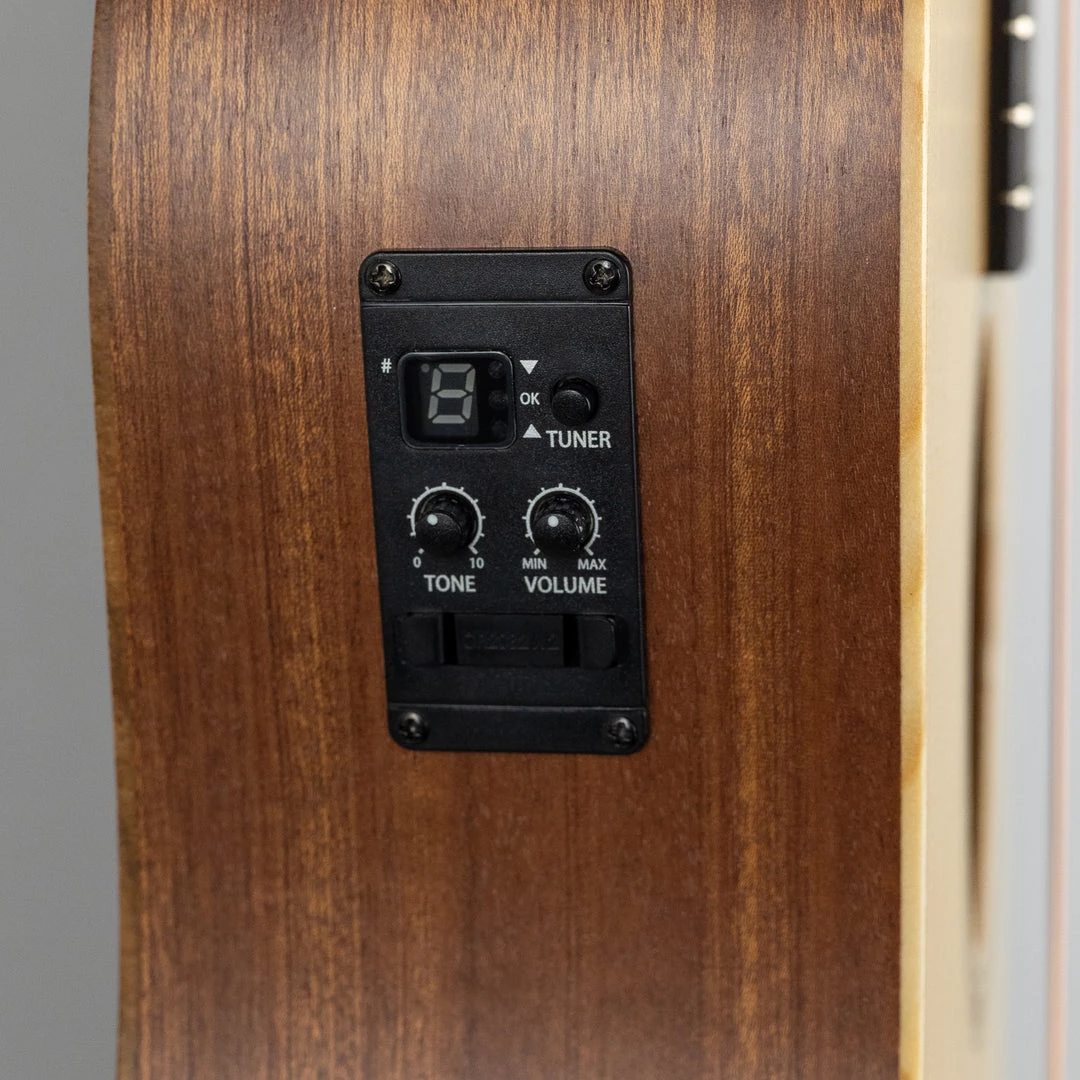 - Sitka Spruce Top: The soundboard choice for most guitars, Sitka spruce produces a broad dynamic range and accommodates a versatile range of playing styles.