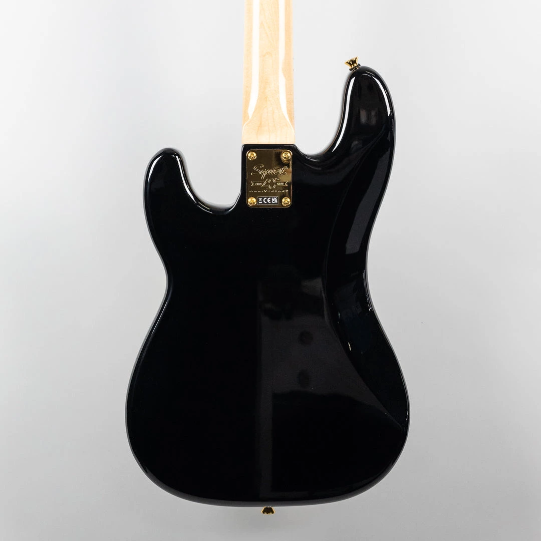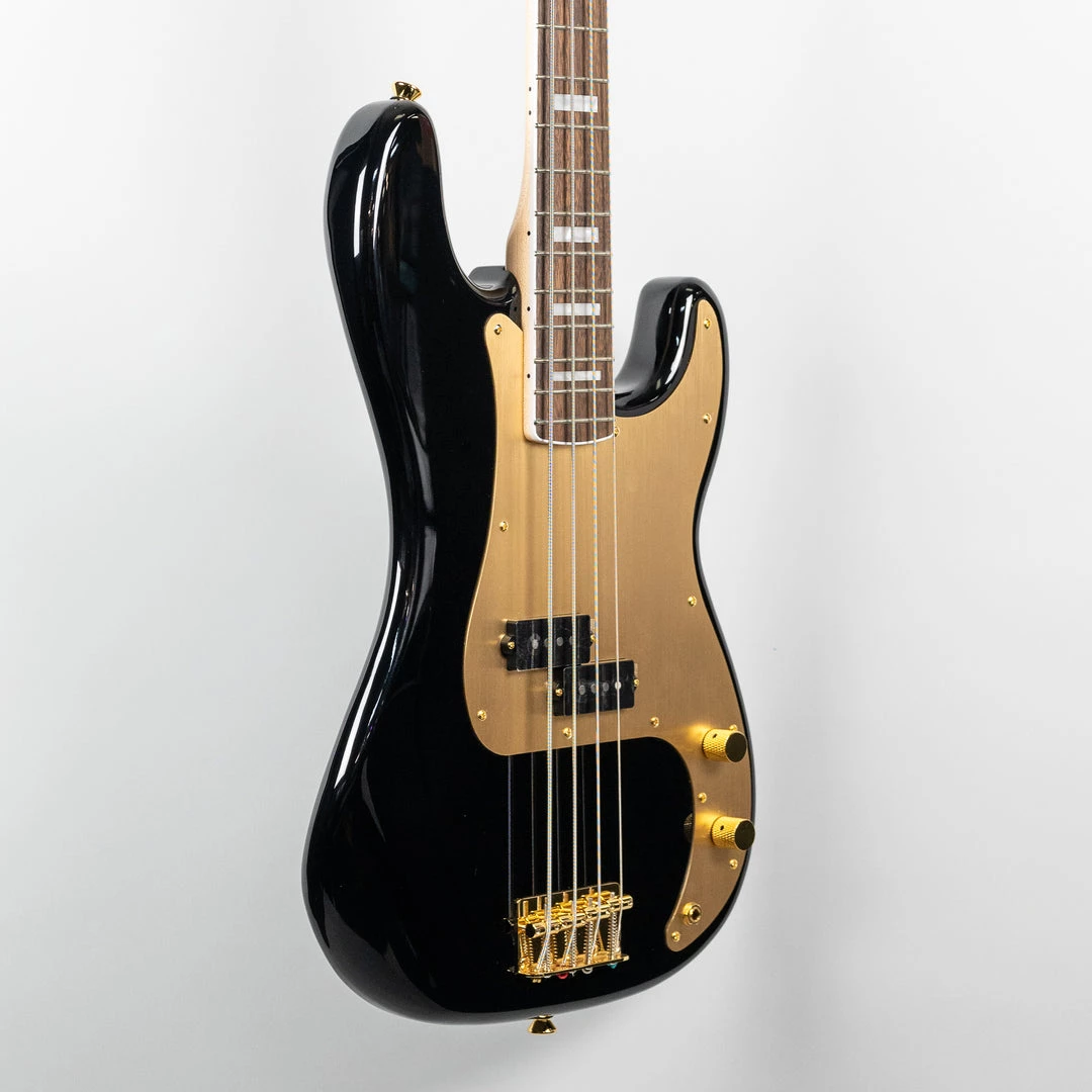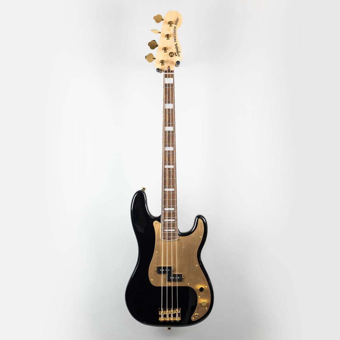 The Squier 40th Anniversary Precision Bass, Gold Edition is a stylish model adorned with an eye-catching collection of upscale features for the discerning Squier fanatic. Featuring striking gold-plated hardware, a gold anodized aluminum pickguard, a bound Indian laurel fingerboard with pearloid block inlays, an engraved anniversary neck plate and gloss finish throughout, this P Bass is poised and ready for the spotlight. Player-friendly refinements of this commemorative model include a slim and comfortable “C”-shaped neck profile for an easy playing feel, vintage-style tuning machines and 4-saddle bridge with barrel saddles for authentic performance and style, and a Fender-Designed split single-coil pickup with alnico 5 magnets for familiar P Bass tone.