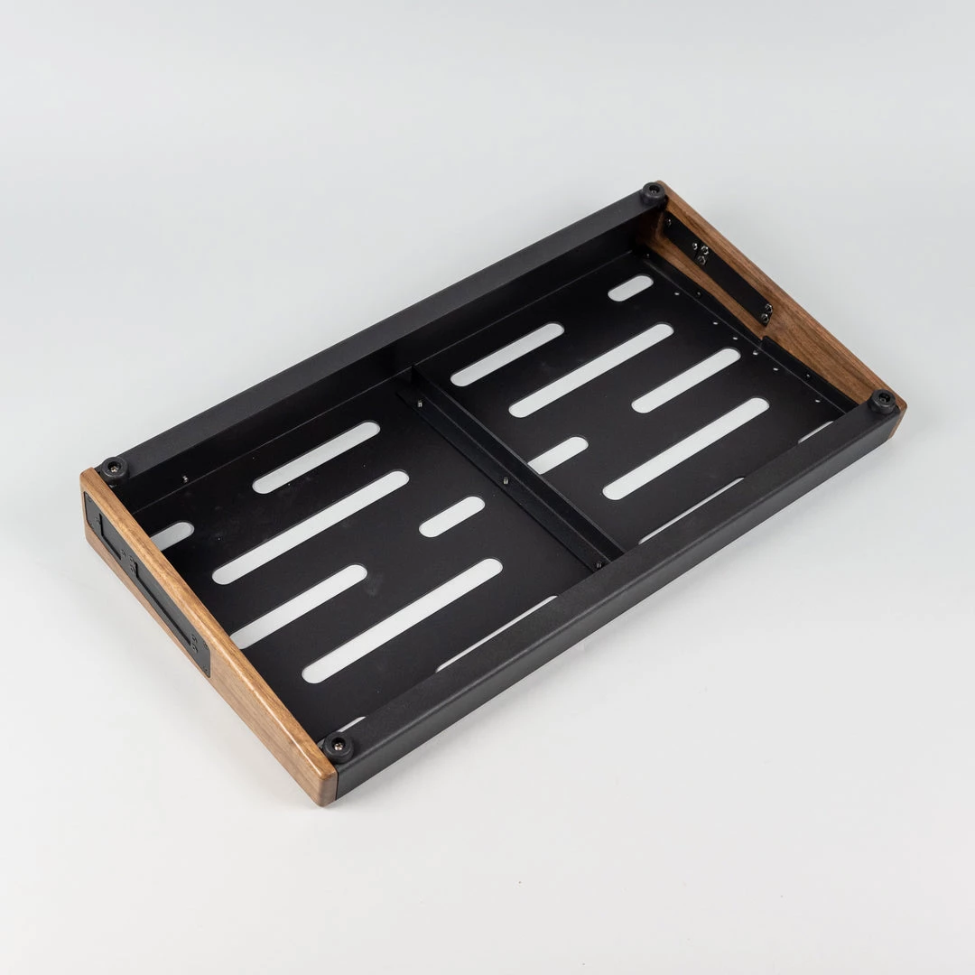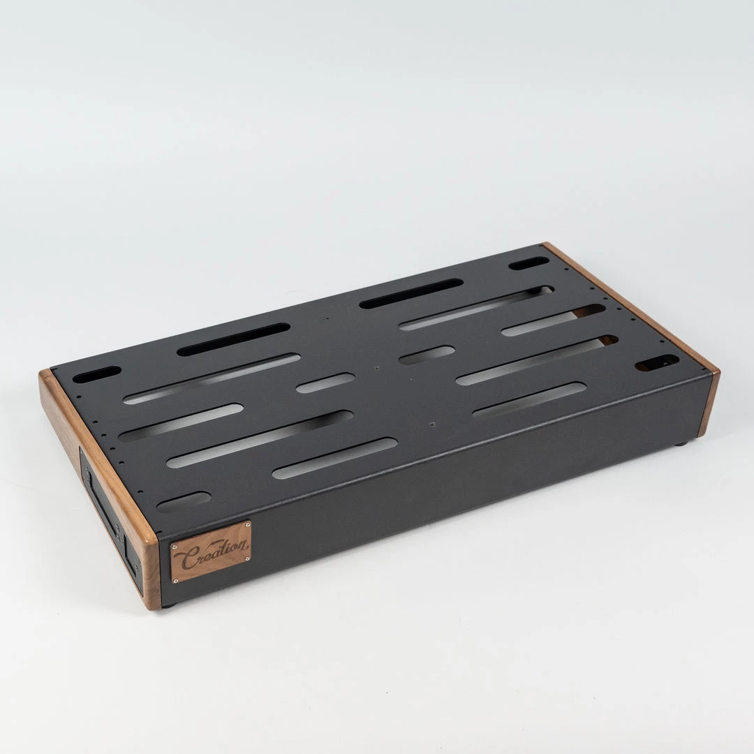 The Elevation V2 pedalboards combine years of innovative design to bring you the quality that has become synonymous with the Creation Music brand. Combining 5052 aircraft grade aluminum, powder coated with a durable matte black finish, and top grade American Black Walnut ends, these pedalboards are both aesthetically pleasing as well as ruggedly durable. The new modular design system makes it easy to install & remove their proprietary modules such as the Patch Bay and Power Unit. All Elevation V2 boards come with 1 outer plate for mounting modules and 2 inner cover plates on each end. The thoughtfully laid out slot pattern and multiple handle holes make pedal organization and cable management a breeze. Whether in the studio or on tour, the Elevation V2 boards are built to last.