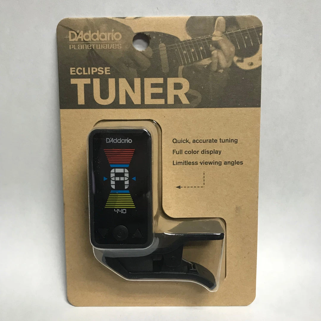 Affordable no longer means compromise. Introducing the D’Addario Eclipse Tuner – the modestly-priced tuner with unparalleled performance. The Eclipse chromatic clip-on tuner offers fast, accurate chromatic tuning on and off the stage. The tuner features a full color vertical display, auto power-off, and pitch calibration in a discreet, compact design. The multi-swivel action allows for the perfect viewing angle and can be mounted in front of or behind the headstock on right- and left-handed instruments. Available in a variety of colors. CR2032 battery included.
