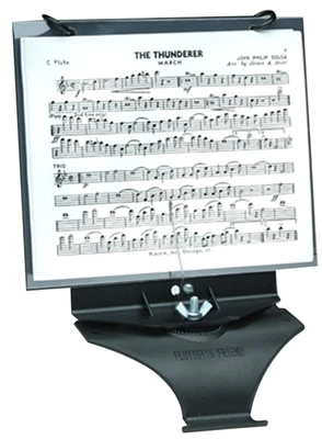 Flutists Friend Marching Flute and Piccolo Lyre is fully adjustable for flute or piccolo player. Can be tilted to proper position for each player. The arm strap is adjustable in order to fit all players and any type of uniform.