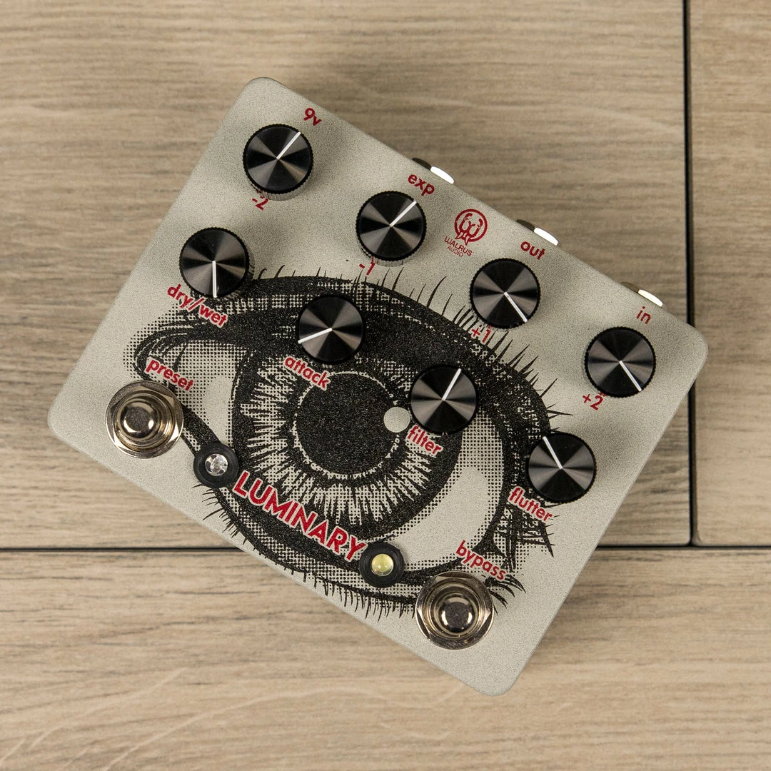 The expression control allows the manipulation of any combination of these options to allow the user to customize the effectiveness of the Luminary: -1 and +1 octave volume, +1 octave volume, Attack, Flutter, and Dry/Wet.