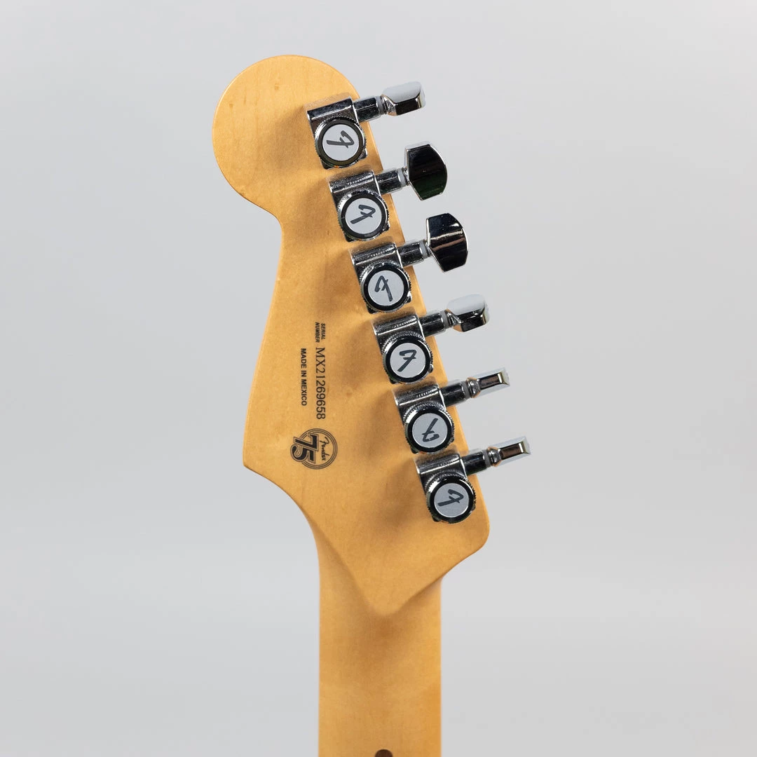 At the heart of this Strat is a trio of Player Plus Noiseless pickups – bright and touch sensitive, they offer classic Strat tone without hum. A push-pull pot on the tone control adds the neck pickup to switch positions 1 and 2 for two sounds not usually found on a Strat. The silky satin Modern “C” Player Plus Strat neck fits your hand like a glove, with smooth rolled edges for supreme comfort. The 12” radius fingerboard and 22 medium jumbo frets facilitate fluid leads and choke free bends. Smooth and responsive, the 2-point tremolo provides classic vibrato effects, while the locking tuners provide rock-solid tuning and make string changes quick and easy.