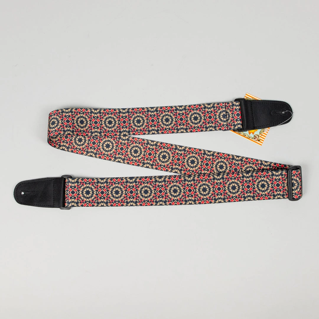 Henry Heller 2″ wide Geometric starburst pattern guitar strap, extends extra long to 62″ and has vegan micro fiber double reinforced ends.