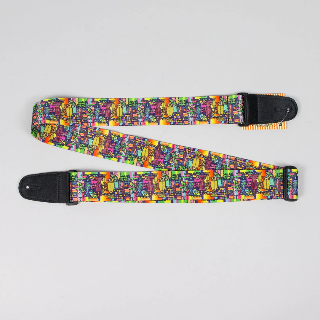 Henry Heller 2″ wide 60’s style Tie-Dye with Artsy psychedelic fish guitar strap extends extra long to 62″ and has vegan micro fiber double reinforced ends.