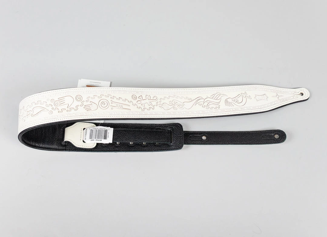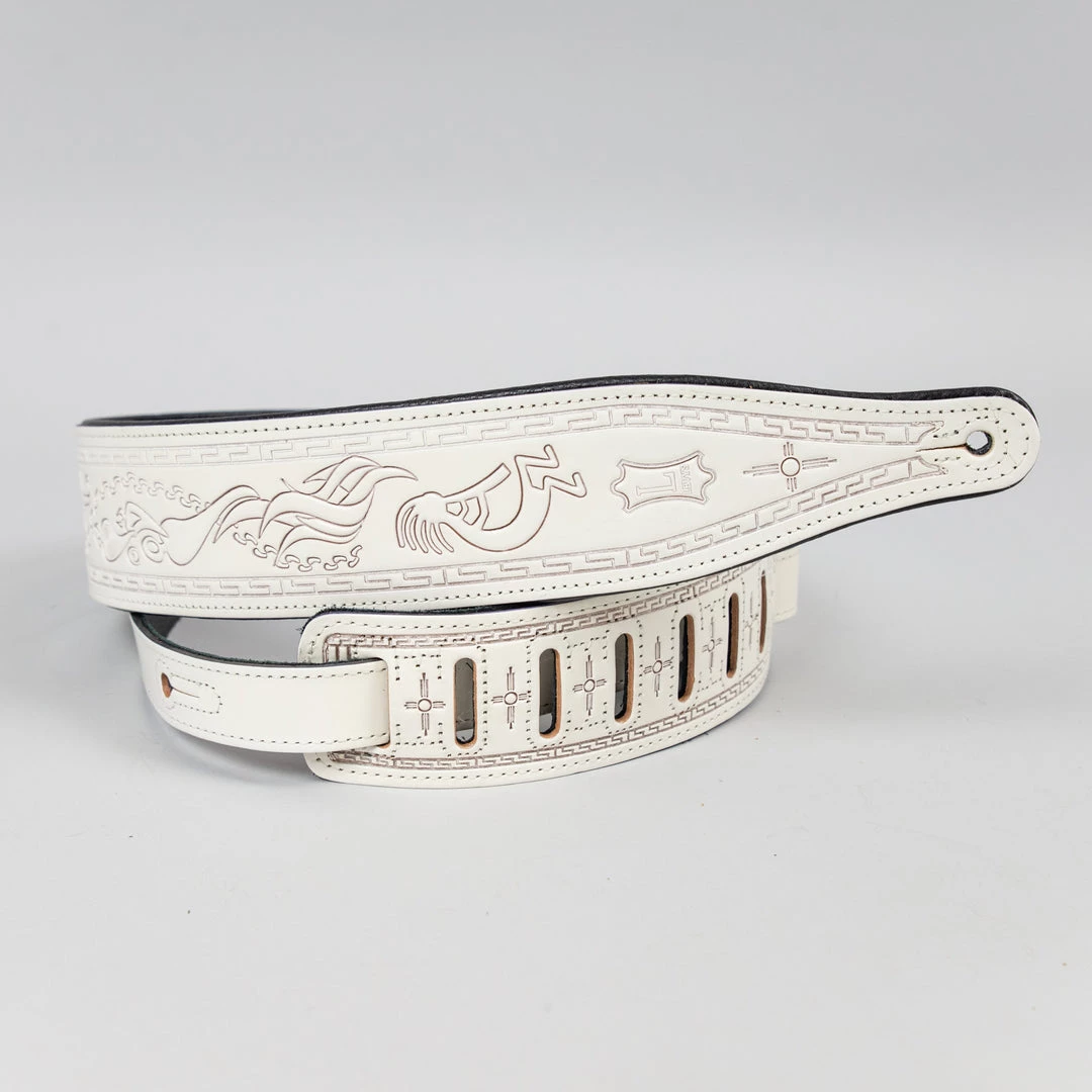 2 1/2″ Veg-tan Leather Guitar Strap With Foam Padding And Garment Leather Backing, Tooled With A Kokopelli Design. Adjustable From 41″ To 54″. White Color