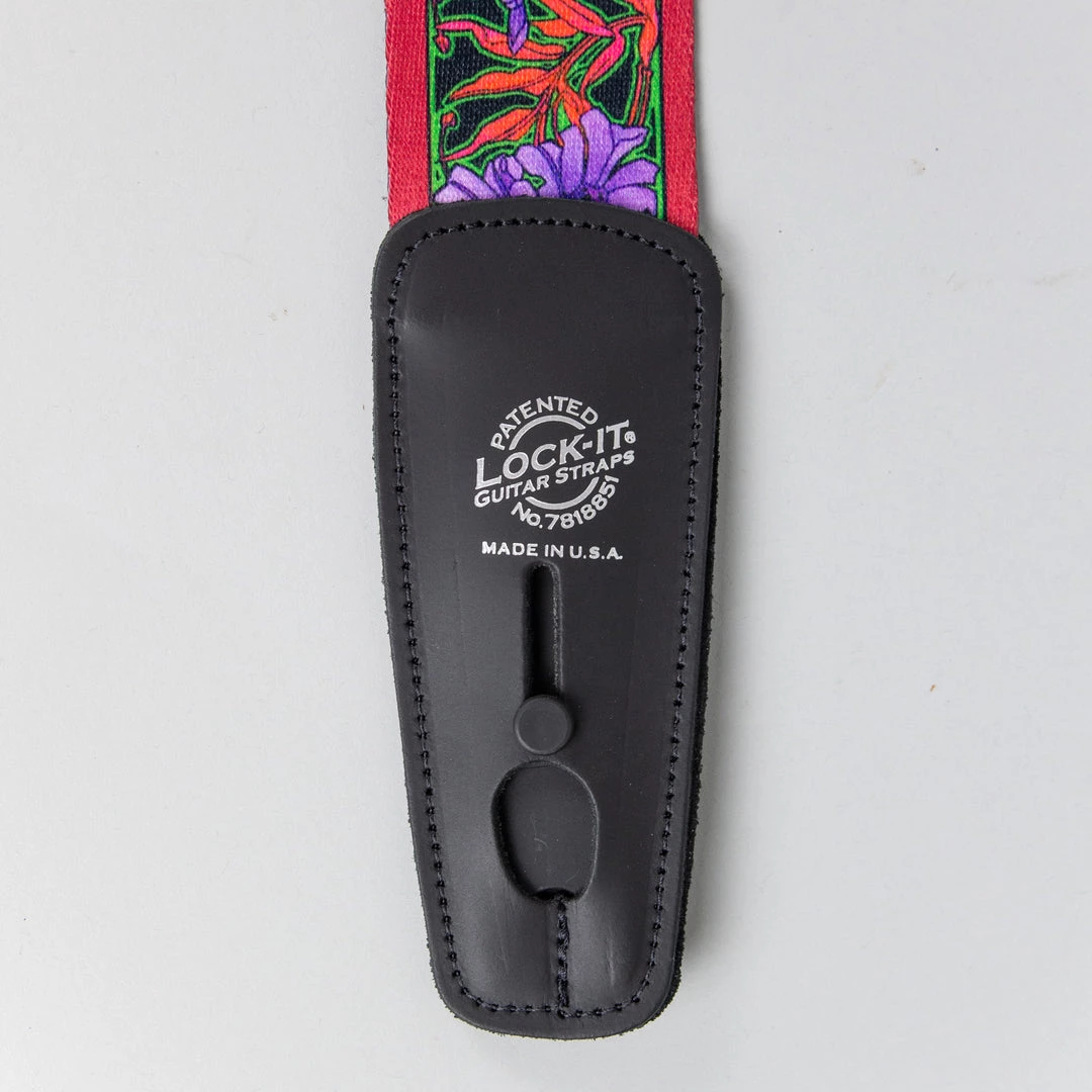Lock-It Straps artist series by Bob Masse who has been making original rock posters influenced by the folk and rock music scene in San Francisco and Los Angeles in the 1960’s and on. All straps are 2″ wide and adorned with the patented and brilliant Lock-It strap locking system. No Guitar mods and a minimalist design sewn into a top class leather end. Straps extend to an extra long 62″ in max length.