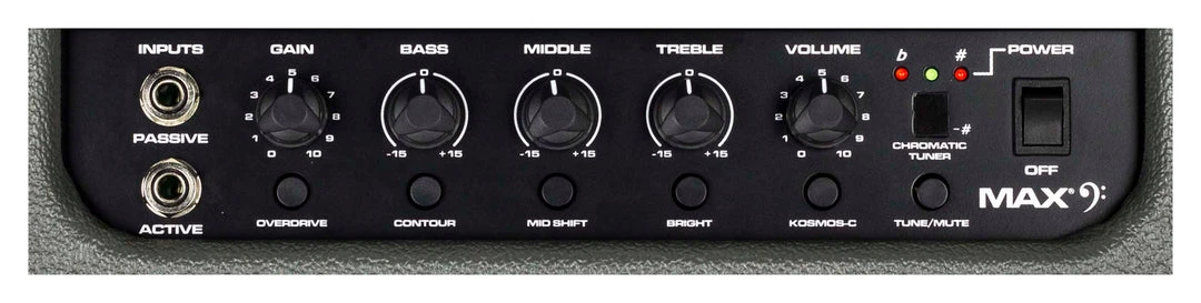 The MAX also features a built-in chromatic tuner with mute, a tuned and ported enclosure, 1/8″ headphone output and 1/8″ auxiliary input. The amp also includes an XLR direct output with ground lift.