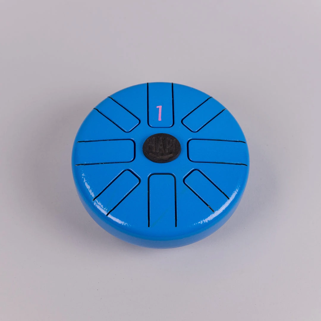 The Tini-Play-Along drum is great for playing songs and also for free form jamming. This is a minor scale based on A, with the pitches A, B, C, D, E, F, and G. Its key signature has no flats and sharps. Its relative major is C major. A4 is the lowest note and A5 is the highest note. It is very compatible with other instruments. Because of its high voice (this is the highest voiced HAPI Drum) it works well as the melody over the top of a bass rhythm. Pairs great with many of HAPI’s other drums and as a stand alone instrument. The notes along the left or right side are all harmonically compatible so it makes it easy to come up with fun patterns to play. While it can be played with fingers the smaller tongue sizes make it so the best sound is with the included mallets. It is very small and portable by like other HAPI Drums has a strong well balanced sound. Take it with you everywhere and spread the joy of music!