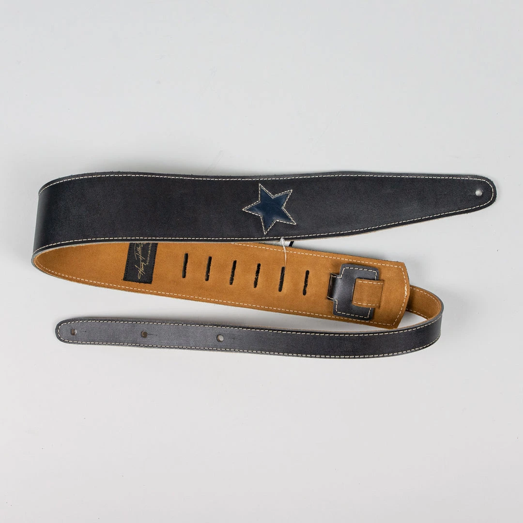 Henry Heller 2.5″ wide black lustrous garment leather strap with a cutout design of a dark vintage blue star with contrasting cream stitching. Adjusts to 54″ in max length
