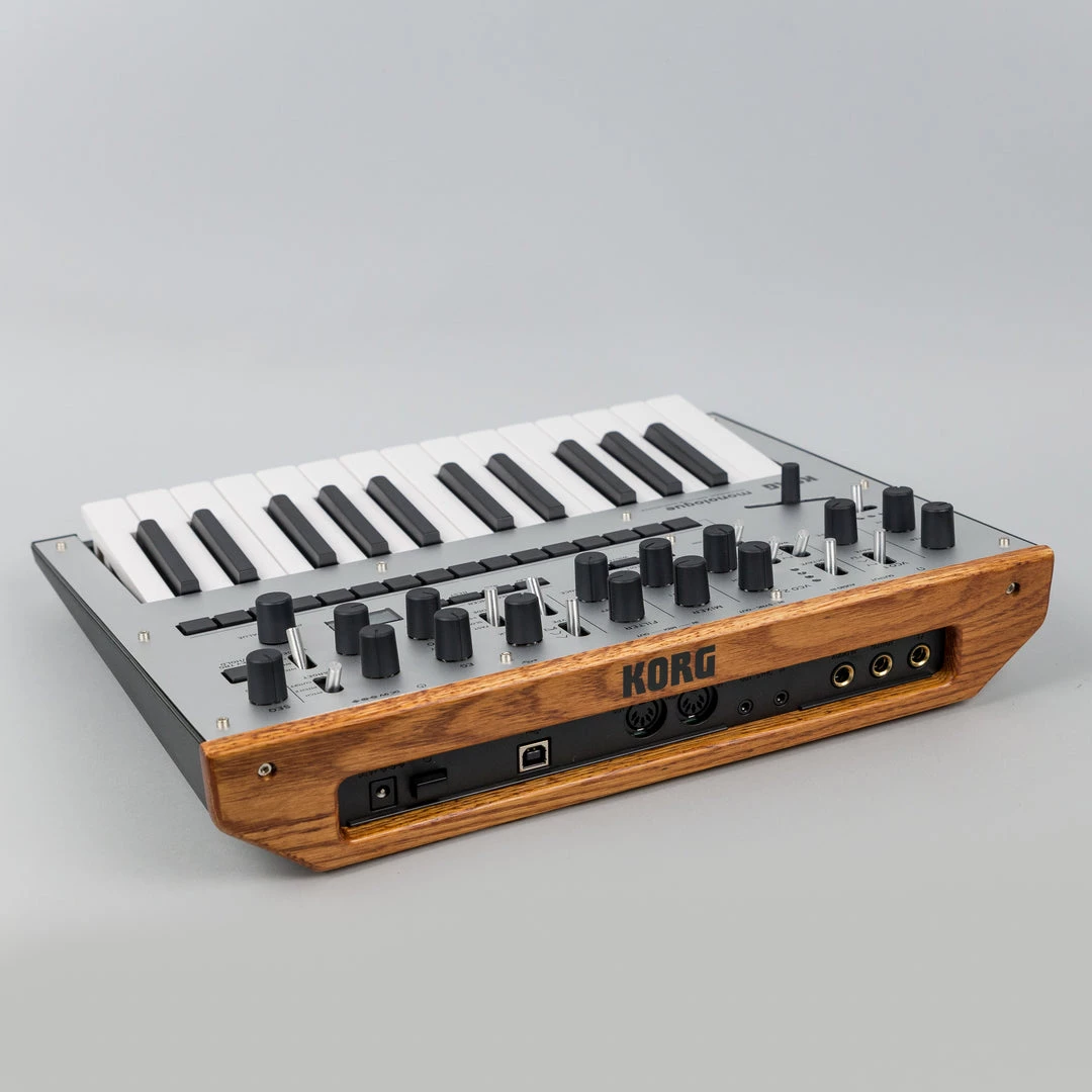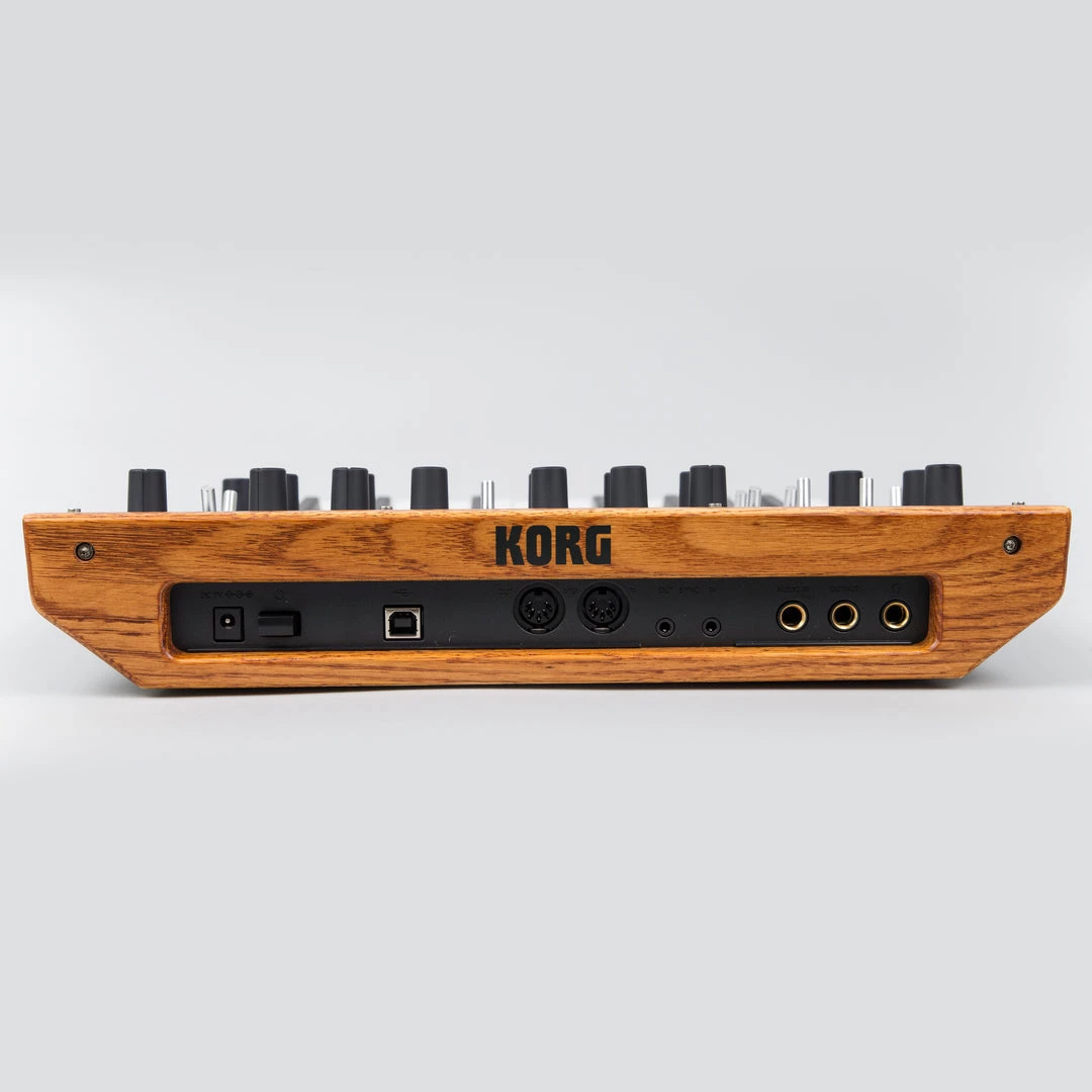 From smooth curves to muscular straight lines. The stylish visuals featuring aluminum and wood are inherited directly from the minilogue, but have been modified to a straight, direct design that bespeaks the power of a monophonic instrument. In spite of its stout construction, the compact and light-weight body is only 1.7 kg / 3.78 lbs., providing an unprecedented combination of toughness and portability.