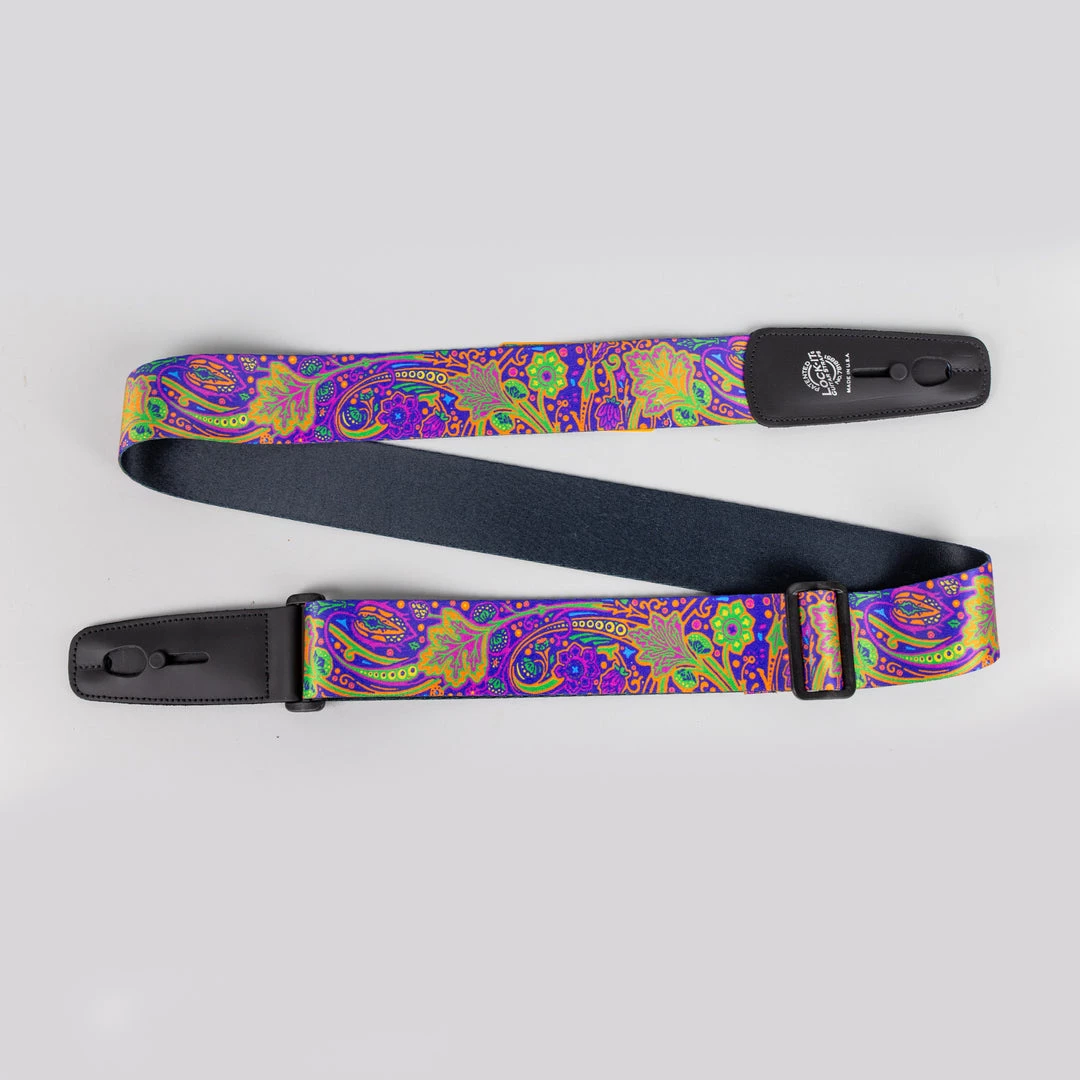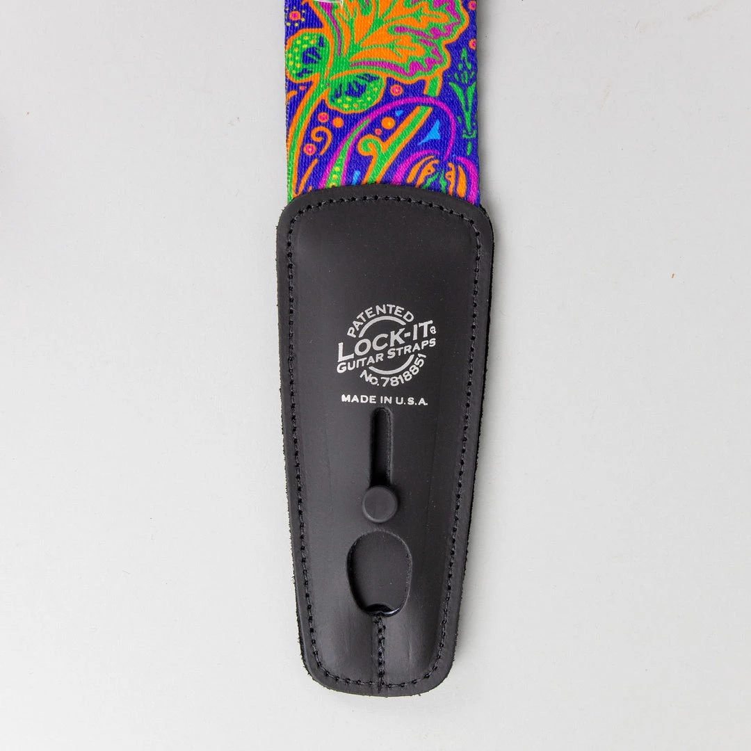 Lock-It Straps artist series by Bob Masse who has been making original rock posters influenced by the folk and rock music scene in San Francisco and Los Angeles in the 1960’s and on. All straps are 2″ wide and adorned with the patented and brilliant Lock-It strap locking system. No Guitar mods and a minimalist design sewn into a top class leather end. Straps extend to an extra long 62″ in max length.