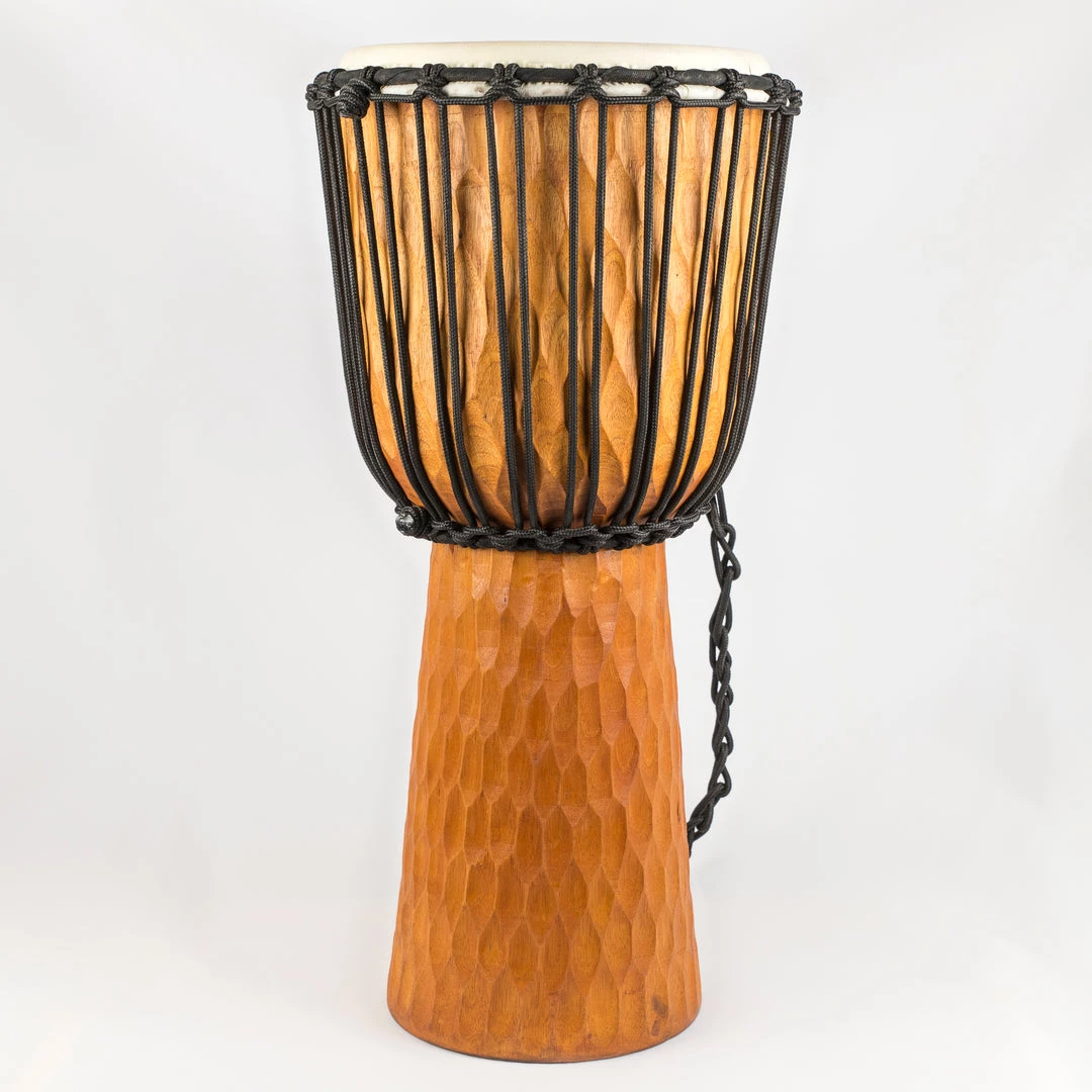 The beautiful looking hand carved shells feature a gouged surface reminiscent of sun-dappled water. This texture not only looks good but also makes djembe easy to hold between the knees. It comes in four different sizes to players of all ages. Hand selected goat heads are secure by the traditional Mali-weave system and runners of pre-stretched nylon PP rope.
