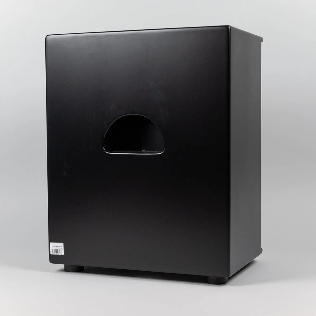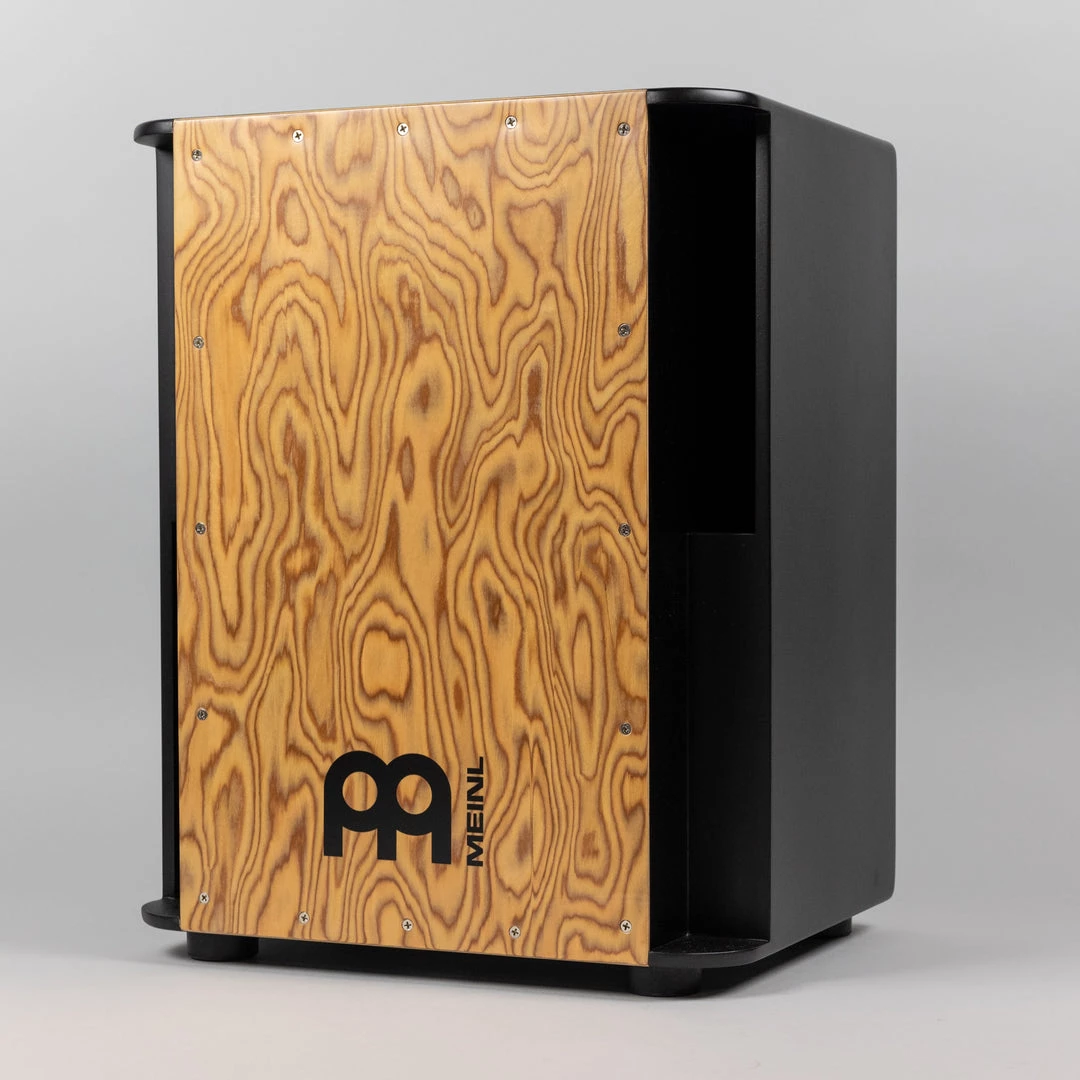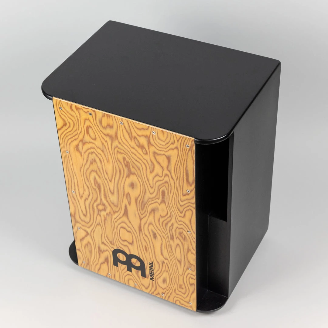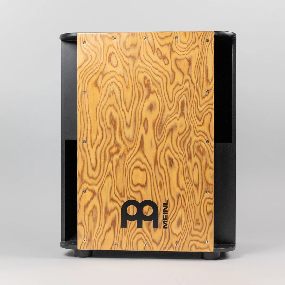 The MEINL Vertical Subwoofer Cajon with black MDF body and Makah-Burl frontplate features forward projecting sound ports in place of the traditional rear facing style and an internal reflex channel that helps develop the sound. This results in enhanced bass note projection, particularly desirable for live and unplugged situations. Fixed internal snare wires deliver a crisp and cutting sound that enhances corner slaps and adds a touch of contrast to the bass notes.