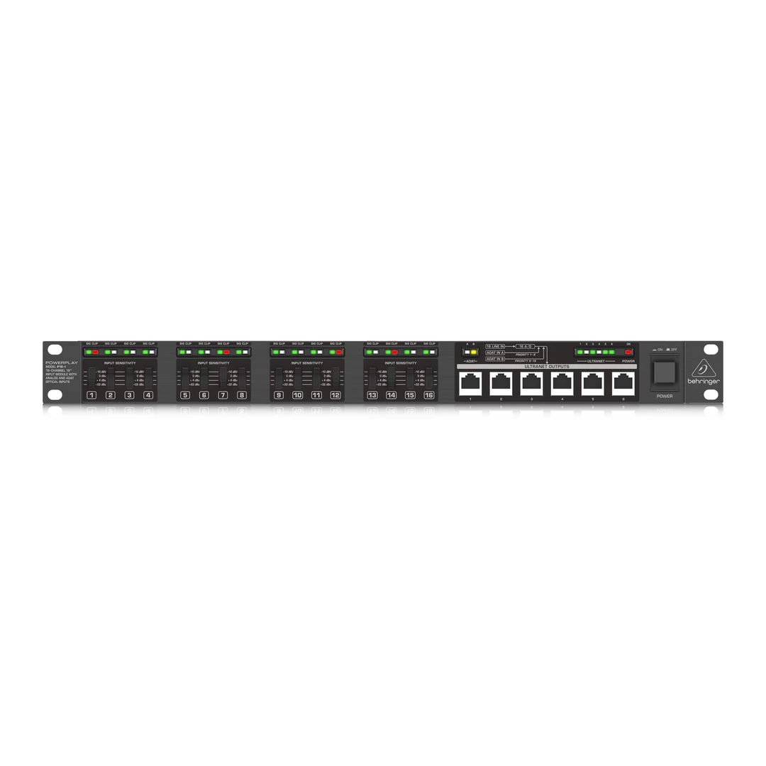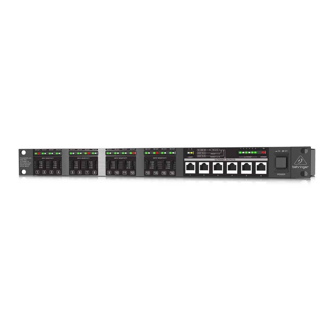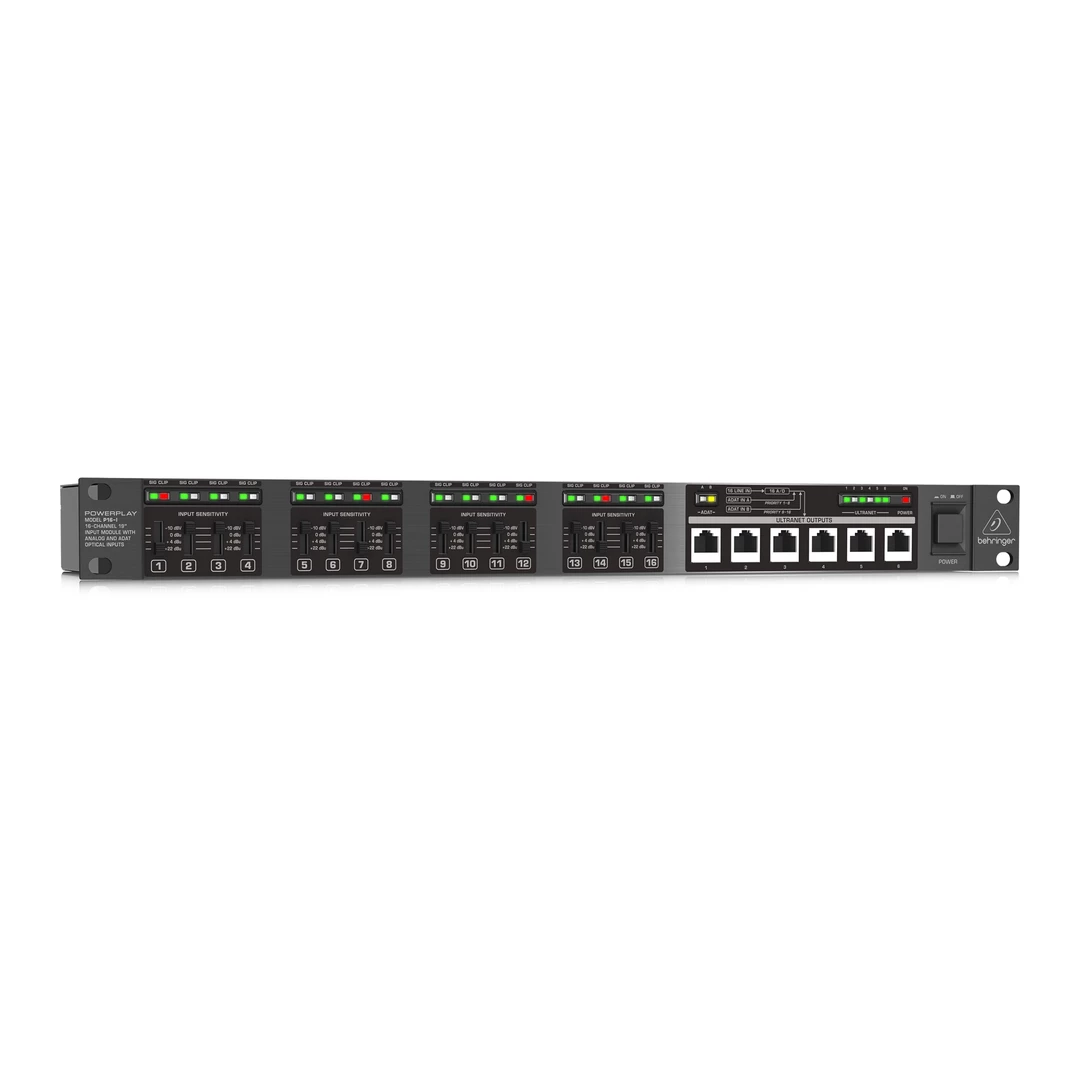 The Behringer P16-I is a Powerplay 16 Series input module offering power and multichannel signal distribution for personal mixing stations in recording studios and live stage applications. With 16 balanced 1/4″ TRS inputs and two 8-channel optical inputs, the P16-I can accept line-level outputs from an analog mixer or ADAT outputs from a digital mixer. 24-bit A/D converters deliver analog-to-digital conversion at full audio fidelity and ultra-low latency.