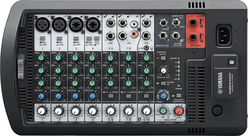 680-watt, portable PA system with 10-channel powered mixer, two 10″ speakers, a Bluetooth input, SPX digital reverbs, an onboard feedback suppressor and versatile EQ.