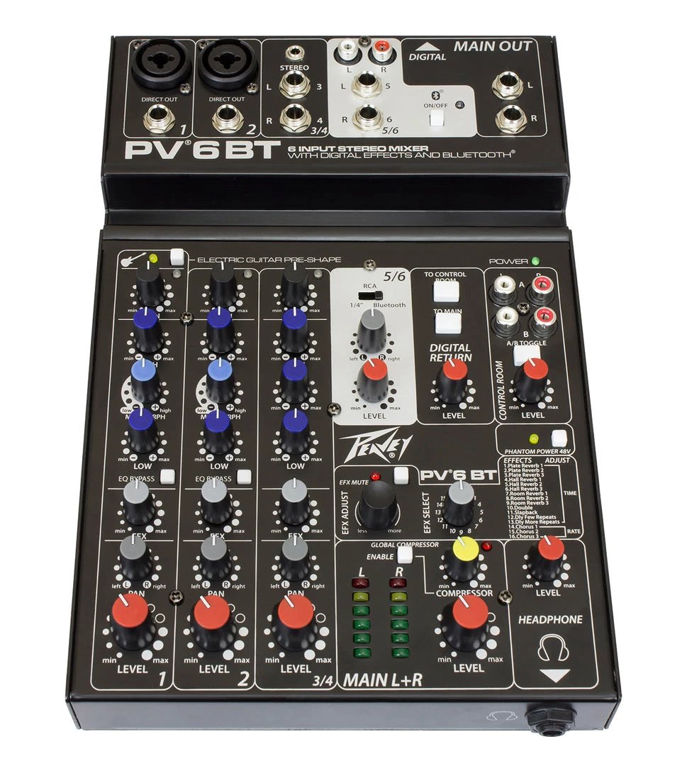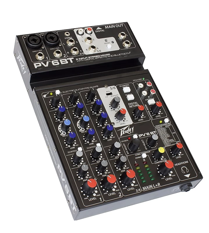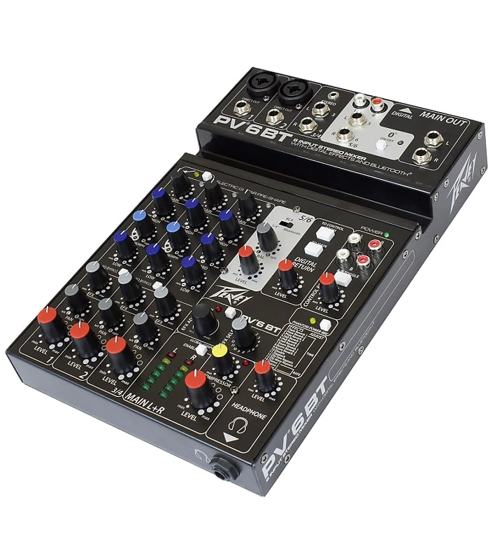 Equipped with Peavey’s reference-quality mic preamps that spec in at an incredible 0.0007% THD, the PV 6 BT mixer is excellent for live or recording applications.