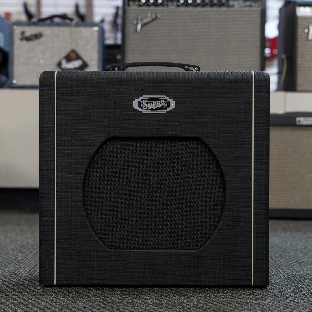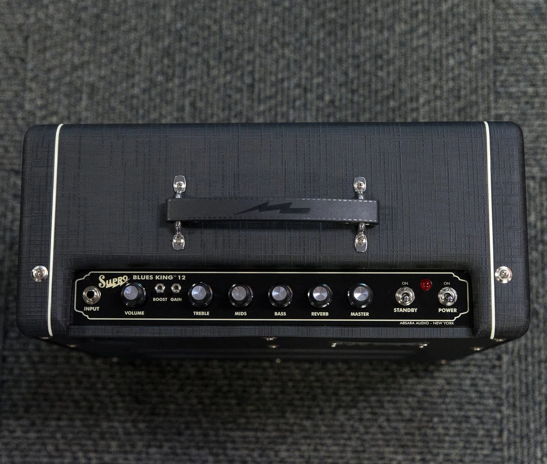 The Supro Blues King 12 combo amplifier captures the vintage Supro amp tone that helped sculpt the sound of early electric Rock & Roll and the British Invasion of the 1960s. The “single-ended” Class-A tube power amp found in the Blues King provides the raw tonal characteristics and remarkable touch sensitivity of these mid-century combos, while delivering a full 15 watts of 6L6 tube power.