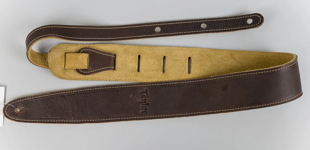 Taylor genuine leather guitar strap with contrasting stitching and suede backing. Embossed Taylor logo. Made in USA.