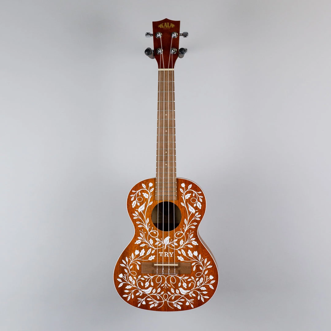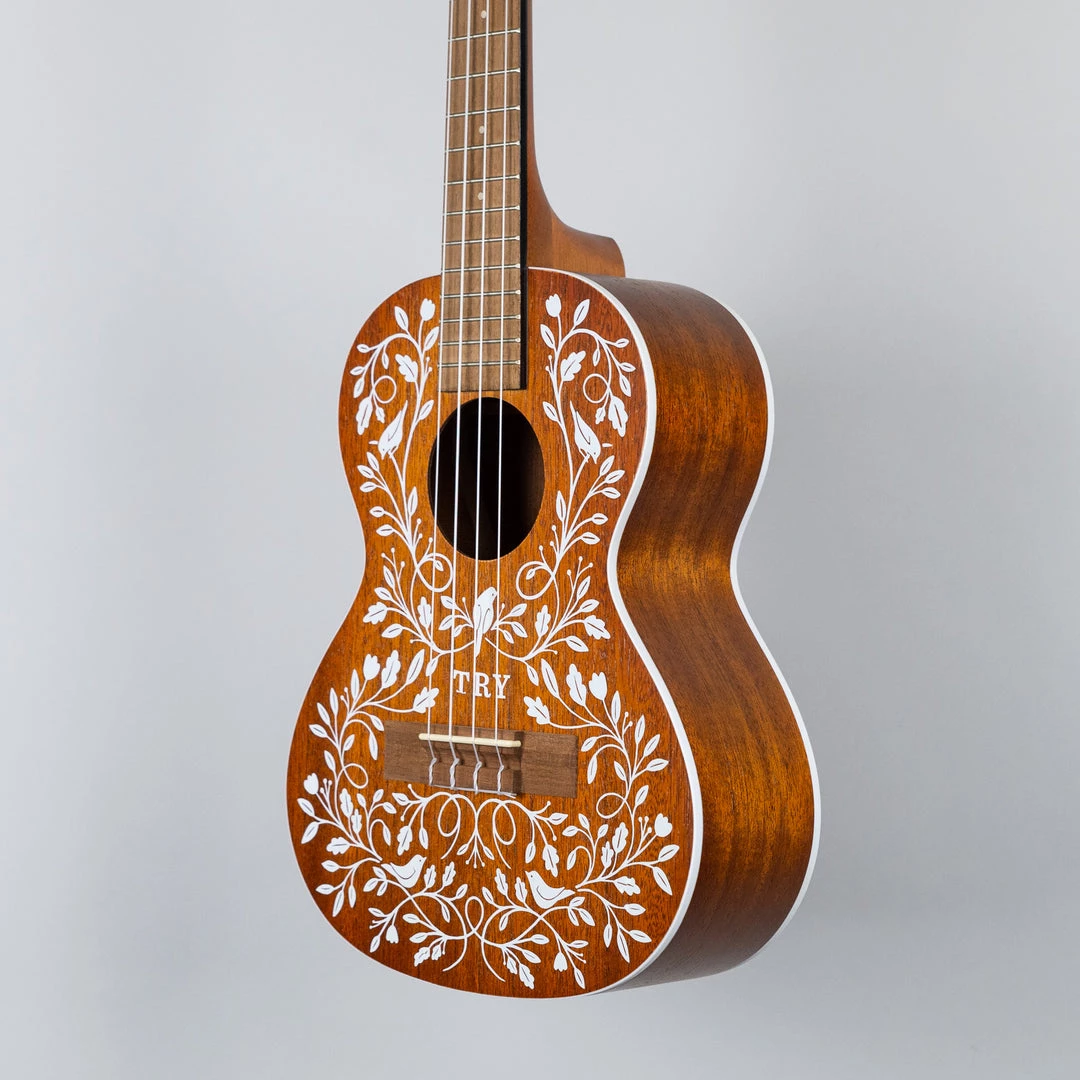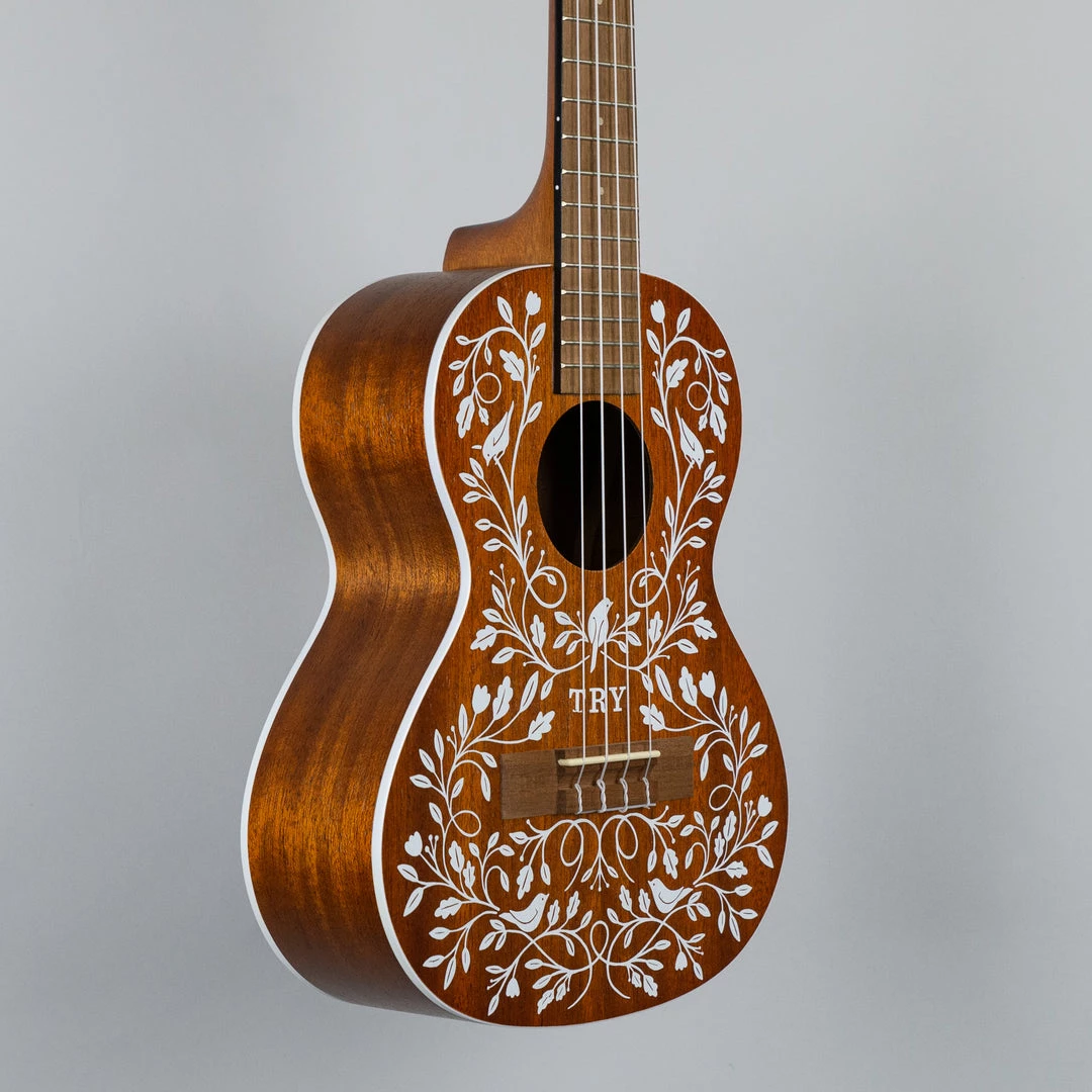The Mandy Harvey Learn To Play Signature Series Tenor Ukulele is made of Satin Mahogany and includes white binding and original artwork reminiscent of 1800s Swiss folk art. The delicate vine pattern with birds and flowers was created by Mandy’s sister, making this a very personal, one-of-a-kind piece of art.